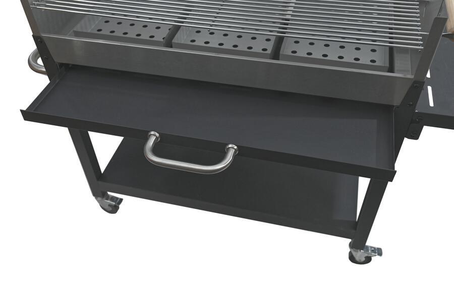 A praktikus, 60 x 35 cm-es oldalsó asztal a grillezőeszközök tárolására szolgál. A grill alsó részén egy tágas, 95 x 60 cm-es tárolóhely található, amely ideális szén vagy egyéb szükséges dolgok tárolására.