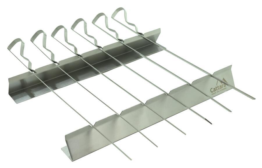 A készlet 6 db 43 cm hosszú és 1,9 mm vastag tűt tartalmaz. A tűk elég erősek nagy adag ételekhez is. A tűk széles (1 cm) profiljának köszönhetően a nyárson lévő hozzávalók nem forognak önkényesen. A vége profilos fogantyúval van ellátva, ami megkönnyíti a tűk kezelését és forgatását az alapon.