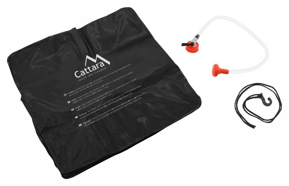 Tartós fekete PVC-ből készült, 40 x 40 x 26 cm-es töltött zacskó külső méretei . A táska úgy lett kialakítva, hogy napsütéses helyen akasztva a víz felmelegszik a kellemes zuhanyozáshoz